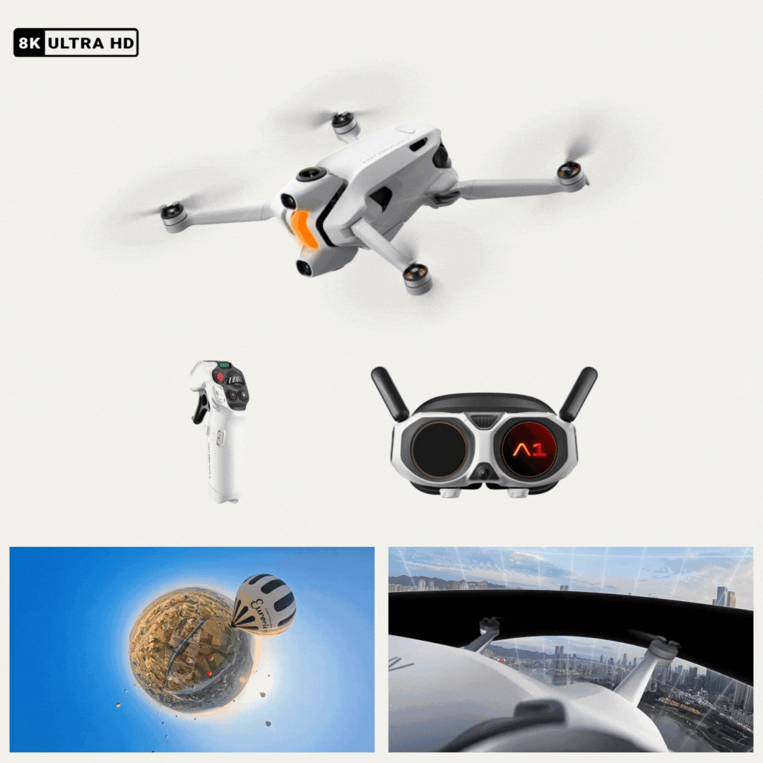 Grazie all' algoritmo di unione delle immagini a 360°, rende il drone completamente invisibile unisce le due lenti (sopra e sotto) e cancella il drone sia nel live feed sia nel filmato finale, senza punti ciechi. Grazie al visore immersivo e al controller intuitivo, hai la sensazione di essere tu a volare: guardi in ogni direzione e registri video a 360° in 8K, vivendo l’esperienza in prima persona.
